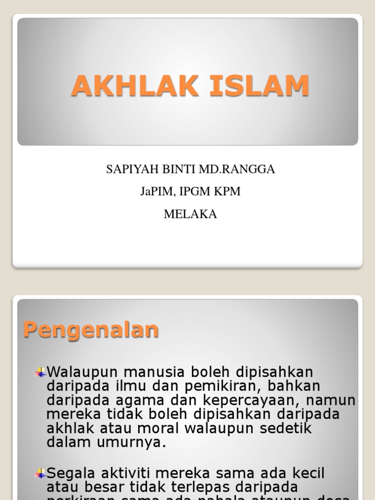 Akhlak dalam Islam membawa keseimbangan bagi tuntutan-tuntutan realiti hidup antara rohaniah dan jasmani serta aqliah dan antara kehidupan akhirat sesuai dengan tabiI. Islam mengajarkan supaya pemeluknya selalu menghambakan diri atau beribadah kepada Allah Subhaanahu wa Taaala menjauhi larangan-larangan-Nya dan melaksanakan. It will further examine issues and problems faced in transmitting the Islamic Adab and Akhlak.
